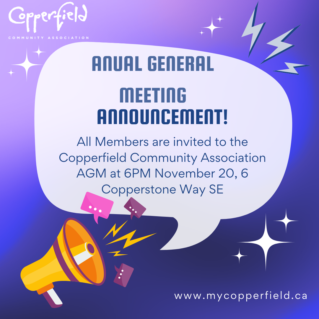 September 28, 2025 by Jason Fiander Notice of Annual General Meeting Post thumbnail Thursday, October 17, 2024 at 6:00pm Copperfield Community Hall 6 Copperstone Way Read More Notice of Annual General Meeting